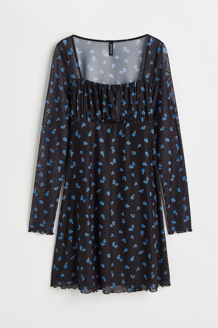 Si eres de las que apuesta por poner flores en tu vestido, esta propuesta para el otoño te encantará. Se trata de un mini vestido de malla con el cuerpo entallada y la falda con un bonito vuelo. Es de manga larga con un escote recto, y un pequeño ribete en los puños y en el bajo de la falda. Tiene un forro de punto para mayor comodidad. Hay dos modelos disponibles, los dos con estampado de flores, uno sobre fondo negro y otro sobre un alegre y otoñal fondo naranja. Es precio es de 19,99€.