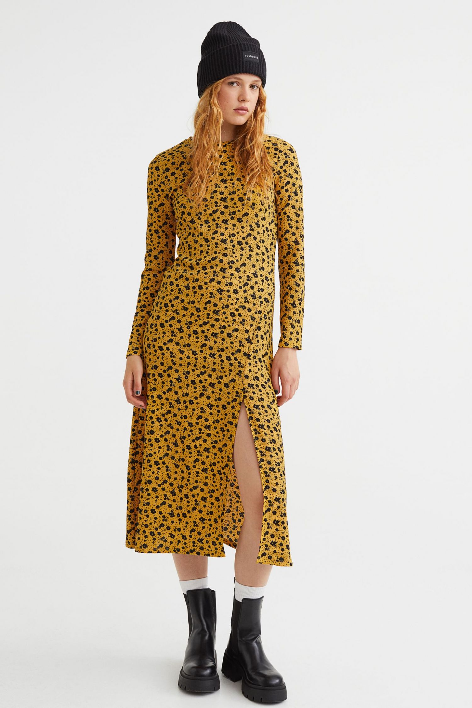 Este vestido midi también es ideal para este otoño. Es de corte midi, con un punto arrugado, informal y estiloso. El cuello es redondo y bastante cerrado, con un cierre de botón en la nunca. Es de manga larga, ceñido al cuerpo y con la falda recta y una abertura larga en la parte de delante. Hay dos modelos, ambos con un estampado minifloral, uno en amarillo mostaza y otro en negro. Puede ser tuyo por 24,99€.