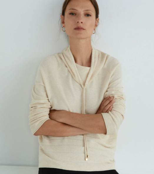 Se trata de un jersey confeccionado casi en su totalidad en algodón, con un corte ligeramente oversize y con un cuello alto rematado con cordones que recuerda a las clásicas sudaderas con capucha.