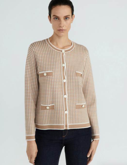 Un buen ejemplo es esta chaqueta jacquard con estampado de pata de gallo. Un diseño de inspiración clásica que pueden llevar mujeres de todas las edades con pantalón o con chaqueta, y que tienes disponible en beige y también en negro.