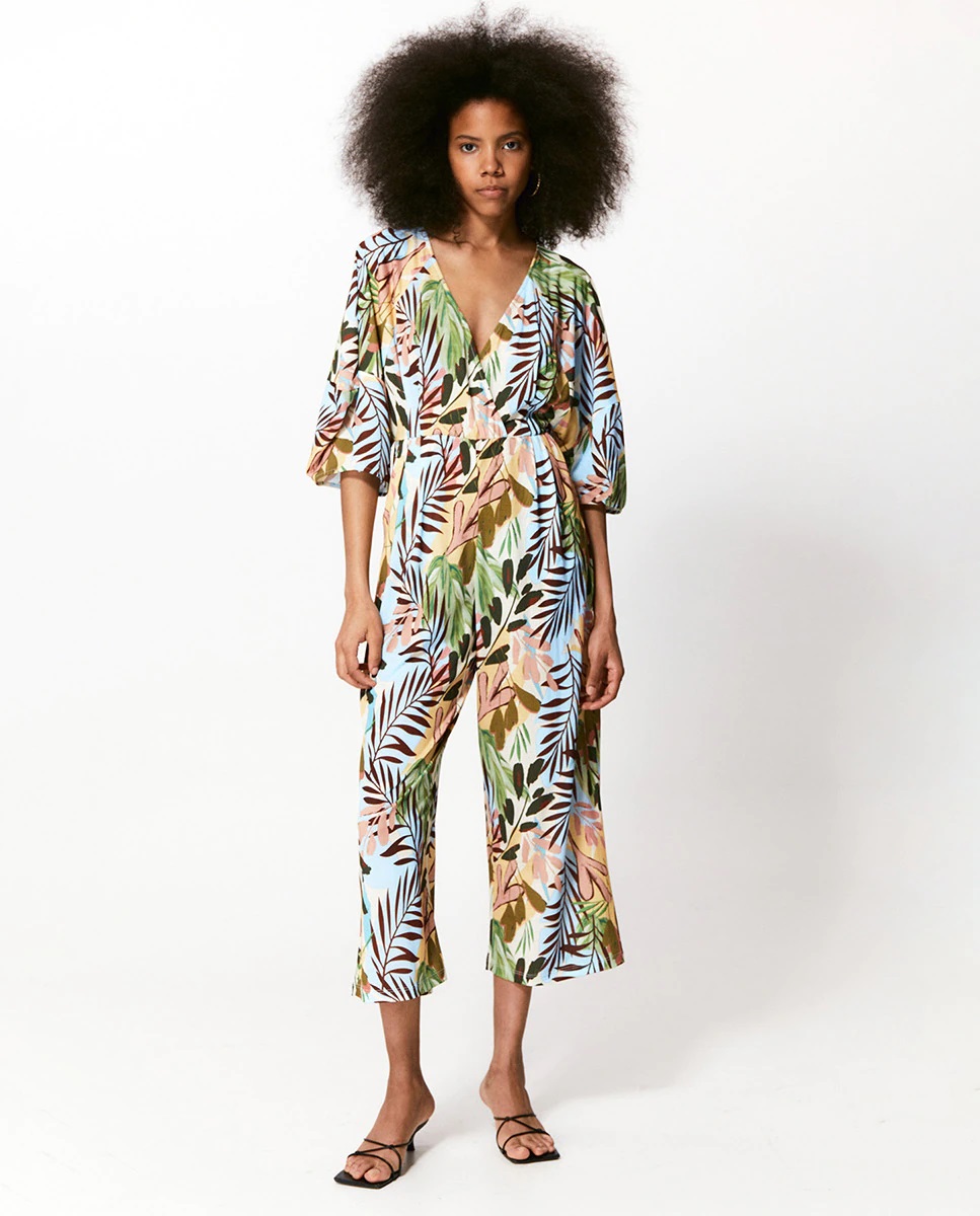 Divertido mono en colores con estampado, ideal para todas tus escapadas de fin de semana. El escote es de pico, tiene manga francesa y ajustado en la cintura. Úsalo con unas sandalias blancas bajas de tiras finas muy retro, una chaqueta sin mangas, y un bonito complemento floral en el pelo.