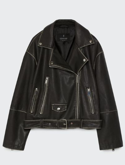 La chaqueta de cuero por antonomasia. Si piensas en las clásicas chaquetas de los 80 que todos los jóvenes de la época llevaban, te vendrá a la cabeza este modelo que nunca pasa de moda. Si necesitas renovar la chaqueta de tu madre, tienes esta cazadora biker vintage disponible en la página web de Stradivarius y en sus establecimientos por el módico precio de 55,99 euros. ¿Qué tiene de especial esta chaqueta? Su diseño de toda la vida, con un cuello con solapa, un corte oversize combinando los detalles de la vieja escuela con la moda actual y un cinturón con hebilla que le da un toque especial a la prenda.