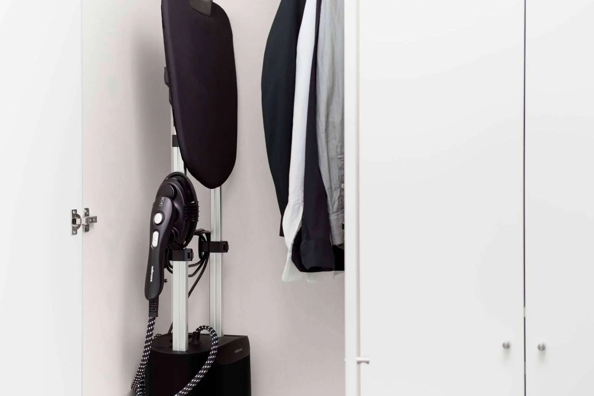 La plancha vertical Steamy cumple con todos esos requerimientos y ofrece una eliminación del 99 % de los gérmenes, bacterias y olores presentes en las prendas. Además, se calienta en poco más de un minuto, dispone de una duración de vapor de 55 minutos y cuenta con cabezal giratorio de 360º, detector de falta de agua y sistema antical.