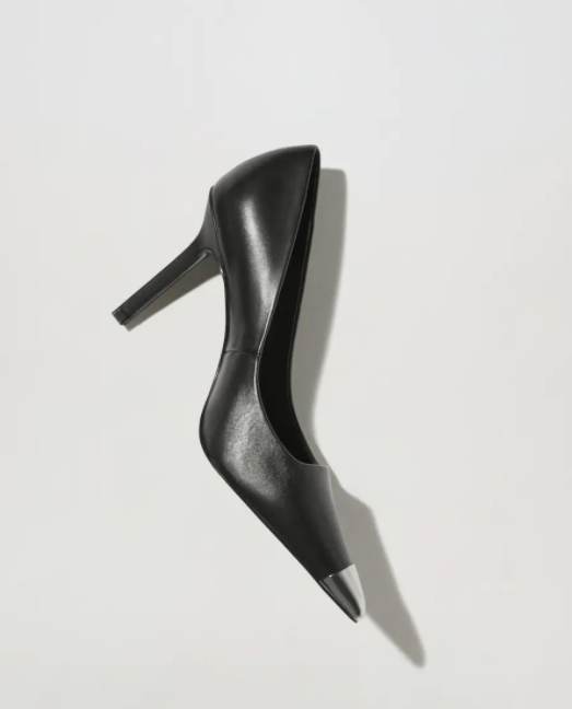 Salones de acabado en punta con un original aplique metálico, de piel y con un tacón de aguja de 8 cm de altura.