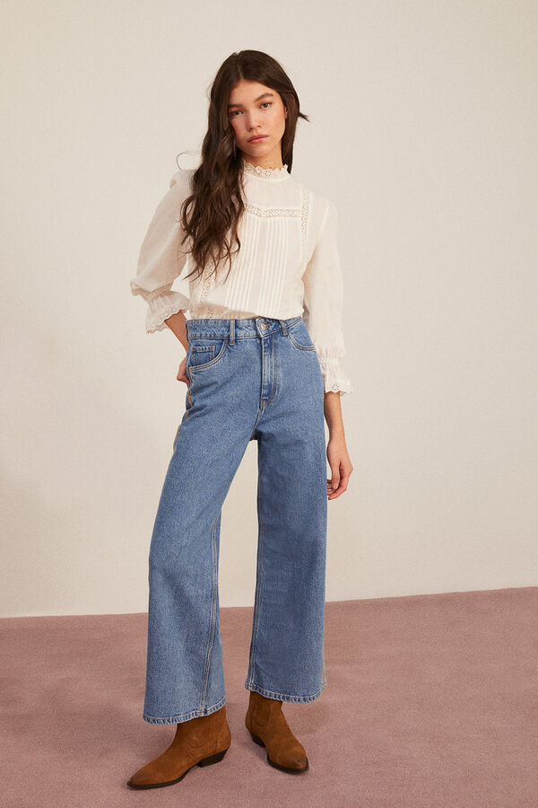 Comenzamos con un diseño de inspiración vintage y con un aire muy romántico. Una blusa de color crudo, con cuello redondo y lace en el cuello y la parte delantera. Con puños rematados con volante.