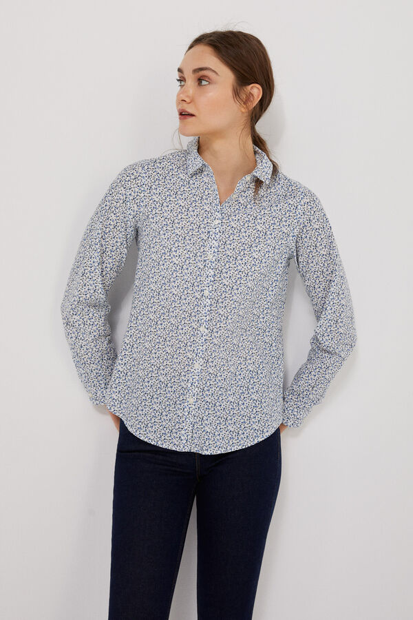Este modelo de base blanca con pequeñas flores estampadas en tonos azules es ideal para llevarlo junto con una falda negra, pero también para combinar con un pantalón de vestir y una blazer del mismo tono.