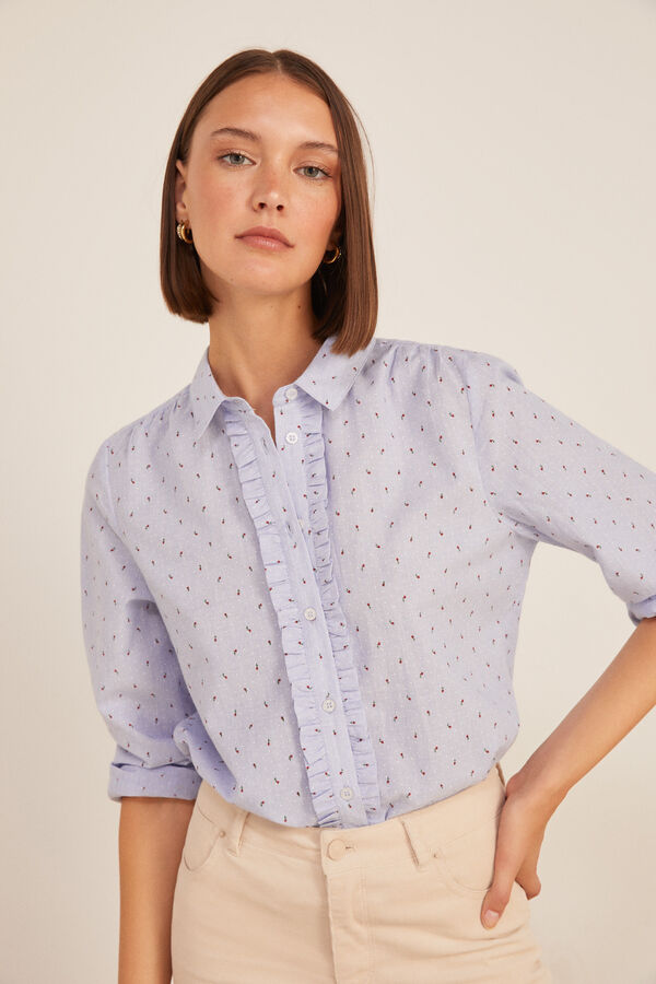 Una bonita camisa con un discreto estampado a la que se le ha añadido un toque original a través de la tapeta central rematada con volante, que le da un aire todavía más delicado.