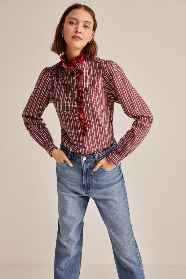 Podría ser una sencilla blusa de cuadros de esas que puedes tener en tu armario durante años, porque sabes que nunca pasa de moda. Pero el llamativo bordado suizo en la parte del cuello y la parte delantera la convierte en algo especial.