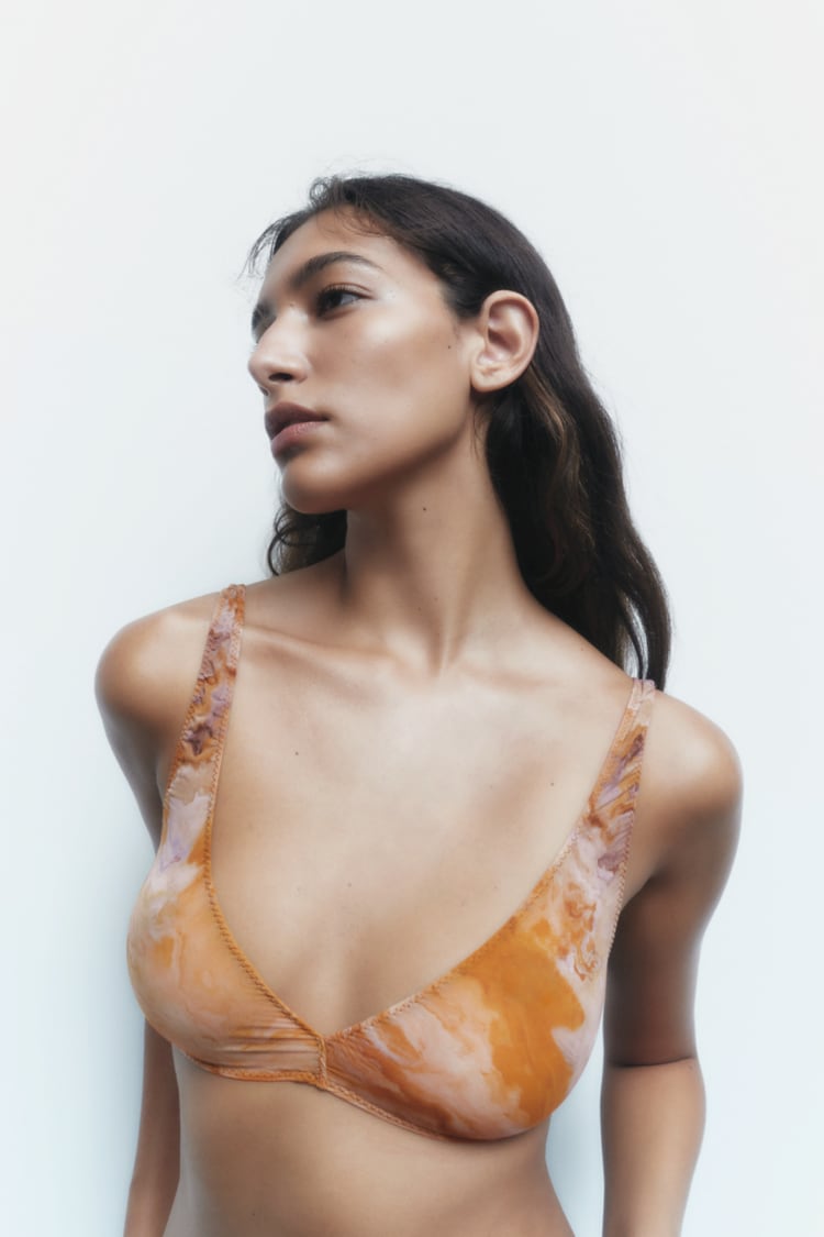 Zara lleva la calidad y el diseño también a la ropa interior, como bien muestra este original bralette de forma triangular y tirantes anchos, que se ajusta en la espalda a través de ganchos metálicos.