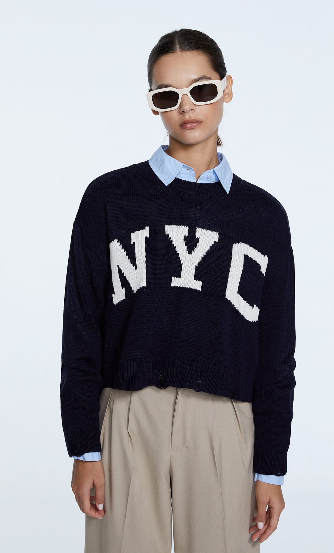 Otra de las opciones más modernas y juveniles de la nueva colección de otoño invierno de Stradivarius es este jersey amplio de punto con cuello redondo que, gracias a sus rotos en las mangas y en el acabado, tiene un toque original y desenfadado. Está disponible en negro, gris y rojo, cada uno de ellos con un estampado diferente. Lo puedes encontrar en cinco tallas diferentes y su precio es de 25,99 euros.