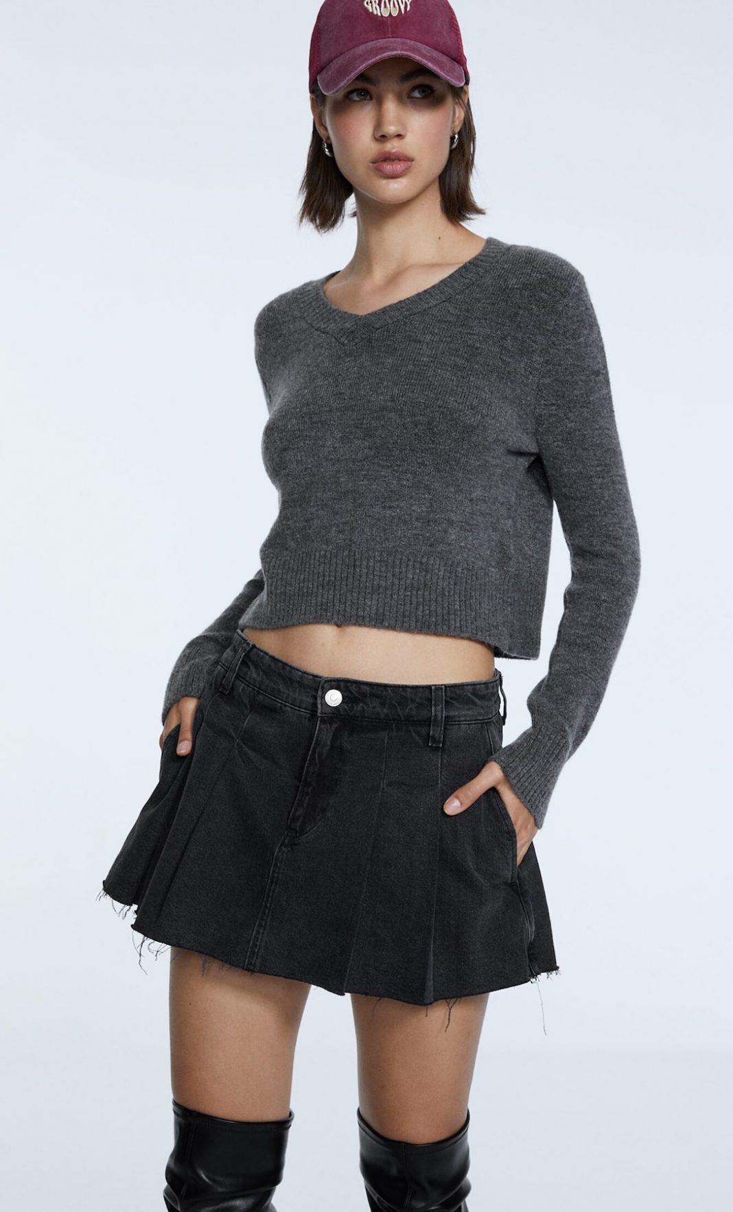Este jersey de manga larga con cuello pico de Stradivarius es una de las alternativas más versátiles de la lista. Puedes usarlo por encima de una camiseta básica o directamente ponértelo a modo de camiseta para días de invierno. Su corte sobrio y sencillo lo convierte en una prenda que te servirá para cualquier ocasión y que combina igual de bien con pantalones que con falda. Está disponible tanto en gris marengo como en negro y su precio es de 22,99 euros.