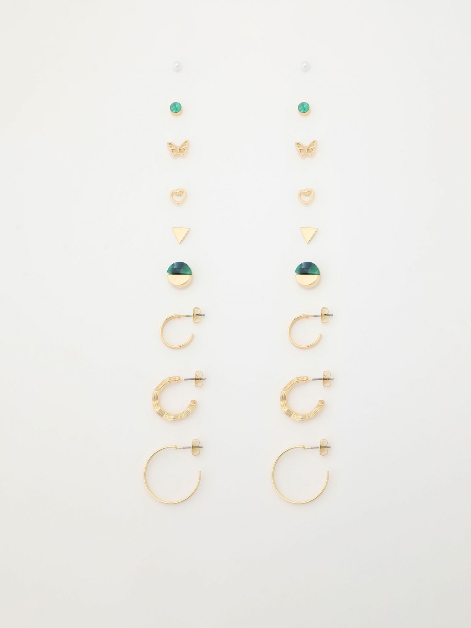 Ahora veremos este pack de 9 pares de pendientes. Estos pendientes te servirán para arreglarte en cualquier cita, sin que tengas que gastar mucho dinero. Todos ellos son diferentes entre sí, con 9 formas únicas, aunque todas ellas son en color dorado.