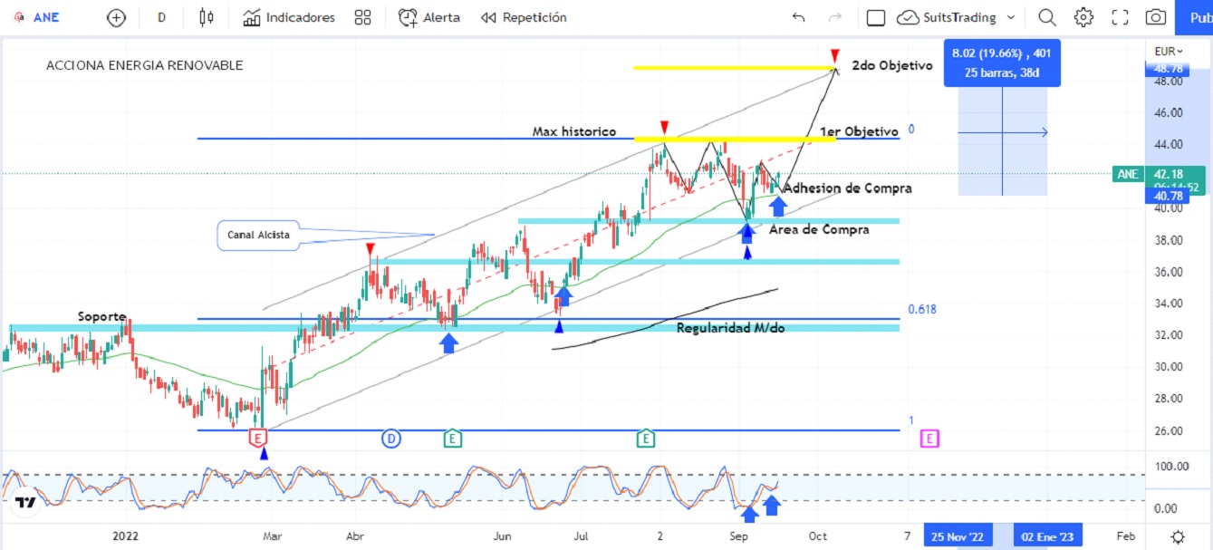 A inicios de la primera semana de septiembre, el precio visitó niveles de 38,7 euros dando punto de giro al alza, el cual ha confirmado a través de la ruptura de la media móvil exponencial de 50 periodos apoyándose sobre ella para adherir compras en busca de un primer objetivo establecido en los máximos históricos sobre 44,2 euros que, de quebrar con solidez, nos llevará a un segundo objetivo establecido en el nivel superior del canal alcista arriba de los 48 euros, lo que representa cerca de un 20% de revalorización a corto plazo.