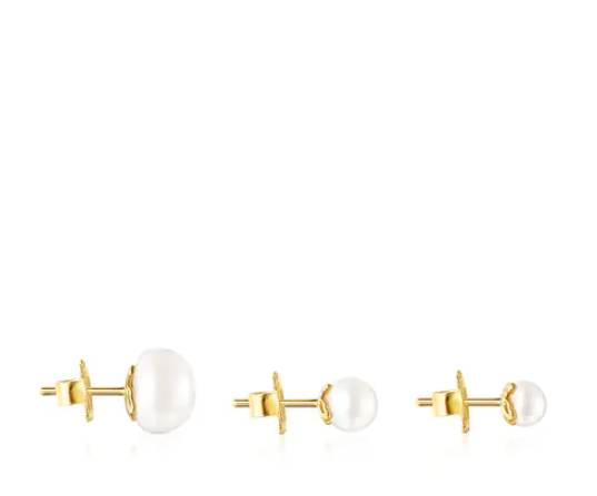 Está compuesto por tres pendientes de perlas cultivadas de agua dulce en diferentes tamaños, para crear un bonito efecto cuando se llevan juntos en la misma oreja. Con engarce de plata de primera ley recubierta de oro y cierre a presión.