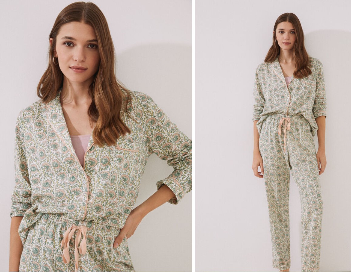 Este es un pijama camisero de Women’Secret 100% algodón, muy suave, que no te querrás quitar. El pantalón es largo y la camiseta tiene manga larga, con un original estampado de flores en tonos verdes, blancos y rosas. La camisa es con escote de pico, escote solapa, bolsillo, puños y botones delanteros. El pantalón largo con goma elástica y trabilla en la cintura para que te sientas cómoda en cualquier momento. Es perfecto para las noches frescas y, por si fuera poco, este pijama pertenece a la colección HONEST por su confección con materiales reciclados, lo que los hace más sostenibles. El precio está rebajado en un 26% y cuesta 25,99 euros.