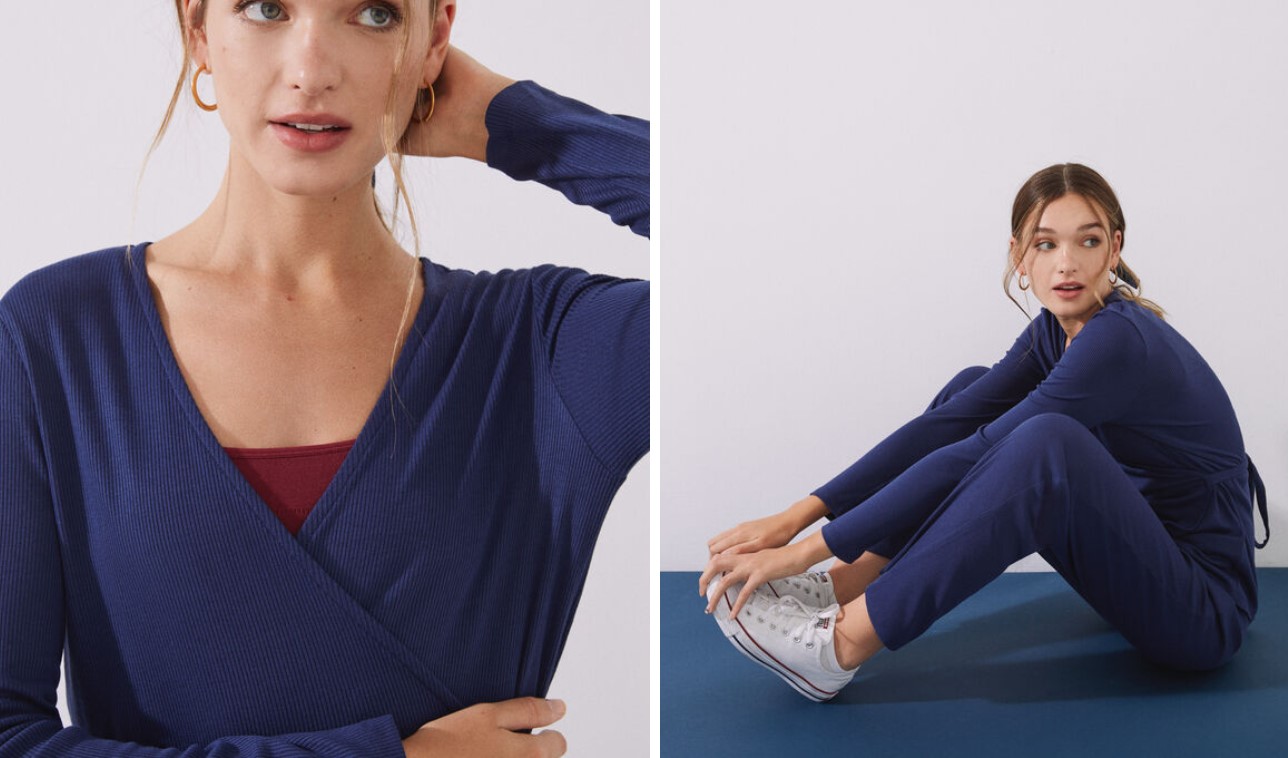 Otro modelo de Women’Secret es este pijama de manga larga y pantalón largo en tejido de canalé en un clásico color azul marino. La camiseta es cruzada tipo «wrap» (envolvente) con mangas con bajo, puños, escote en pico y lazo ajustable que resaltará tu figura. El pantalón es acampanado con cinturilla elástica para que estés cómoda en todo momento. El precio está rebajado en un 25,99 euros y cuesta 25,99 euros.