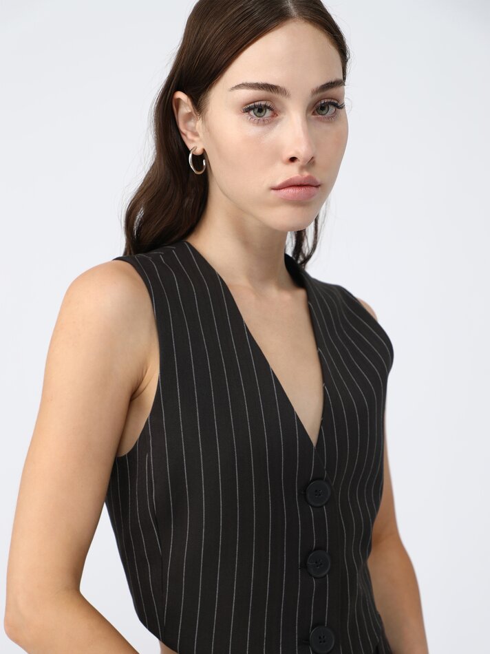 Como decíamos, los chalecos son la prenda por excelencia del otoño. Lefties lo sabe y, por eso, entre sus novedades ha lanzado este increíble y favorecedor chaleco Tailoring con cierre de botones confeccionado con poliéster, viscosa y elastano que le aporta una comodidad extra. Está disponible en negro con rayas tipo traje y en gris marengo. Si no sabes cuál elegir, no te preocupes porque su precio es de tan solo 19,99 euros, por lo que podrás comprarte los dos al precio de lo que cuesta uno en otras marcas.