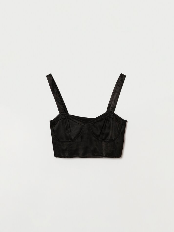 Otra de las mejores opciones que puedes encontrar en Lefties es este top corset satinado de tirantes finos regulables y escote en pico. Las costuras delanteras de la prenda emulan un corset y está confeccionado en un cómodo tejido fluido y satinado. Es una opción genial para una noche de fiesta y puedes combinarlo tanto con pantalón como con falda. Su precio es de 12,99 euros y está disponible en cuatro tallas diferentes.