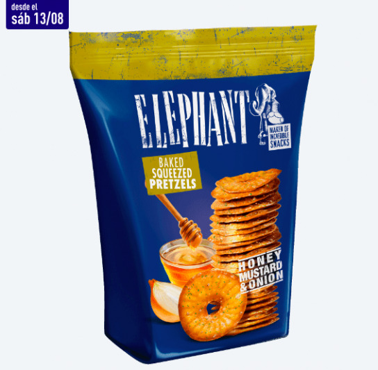 El siguiente snack de nuestra lista pertenece a la marca Elephant y, al igual que el anterior mencionado, está disponible en tres variedades diferentes. La receta original contiene sésamo negro y blanco, es ideal para aquellos amantes de los sabores clásicos. Por otro lado, también está disponible con cebolla y salsa de mostaza y miel, una opción para aquellas personas que buscan sorprenderse con un alimento diferente. En último término, están los pretzels con sal marina.