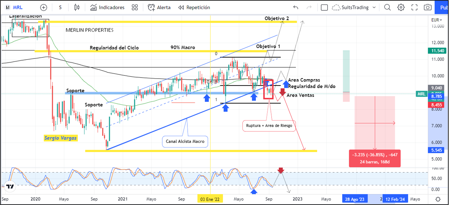 La situación se agrava en territorio europeo y la experiencia dicta que uno de los sectores de fuerte desplome en situaciones de crisis es el inmobiliario por lo cual, Merlin Properties pende de un hilo, o básicamente de un soporte. Las tensiones geopolíticas que comenzaron a inicios de este año por la incursión bélica de Rusia contra Ucrania han evolucionado en mayor conflicto, poniendo a Europa entre Estados Unidos y Rusia. La dependencia de las importaciones de energía provenientes de Rusia son el talón de Aquiles para la Comunidad Europea que la tiene arrodillada y con una clara amenaza de recesión, razón que le dio a Christine Lagarde, presidenta del Banco Central Europeo a incrementar los tipos de interés el 0,75%, lo que corresponde a la mayor subida de la historia en la zona euro y con la premisa de mayores incrementos en los próximos meses.
