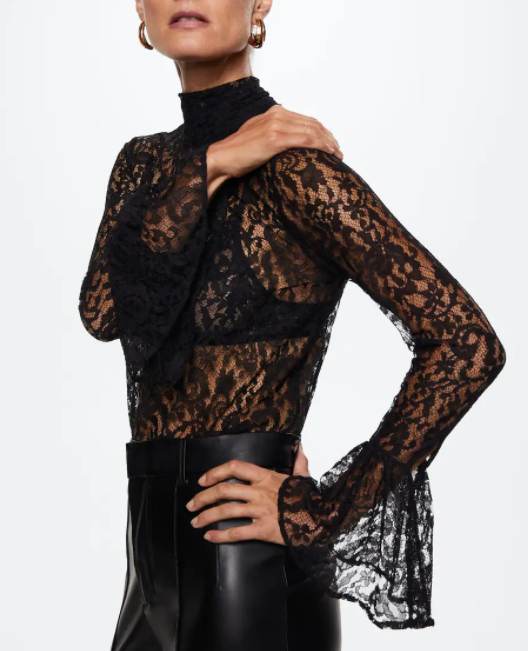 Nos parece una prenda bastante difícil de entender y de combinar. El guipur es totalmente transparente, algo que es tendencia, pero no tiene sentido combinar esto con un cuello alto que pretende “abrigar” esa zona.