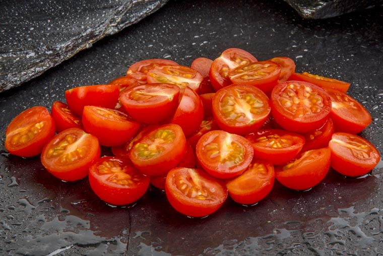 Después, limpiamos bien los tomates cherry y los cortamos por la mitad. Necesitaremos una cantidad suficiente de mitades como para cubrir el calabacín. A continuación lavamos el perejil fresco, retiramos los tallos y cortamos las hojas muy finamente. Picamos muy fino el ajo y lo mezclamos con el perejil. Preparamos también el pan, cortándolo en rodajas finas.