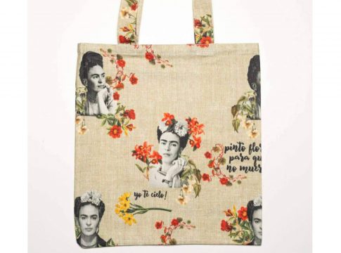 Distintas fotos en blanco y negro de la artista se pueden ver en estas cómodas tote bags, acompañadas de coloridos dibujos florales, representativos de su estilo artístico. Además, aparecen impresas algunas de sus frases más icónicas, como «pinto flores para que así nunca mueran», «yo te cielo» o «pies, ¿para qué os quiero, si tengo alas para volar?». El fondo sobre el que se sitúan estos bonitos detalles está disponible en tres colores: natural, beige y negro.