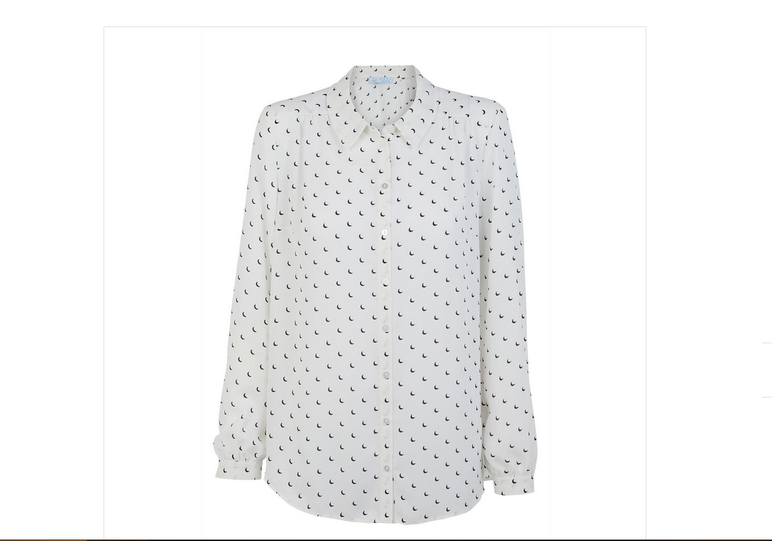 Es un modelo crepé blanco, con estampado en color oscuro, con un tejido fino, cuello con solapa, cierre frontal con botones, y puños también con botón.