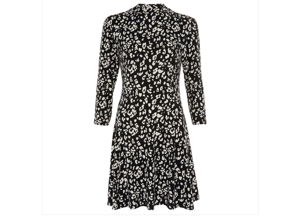 Se trata de un vestido estampado suave con vuelo y detalles en blanco y negro. Su precio es de tan solo 8€, y tiene poco que envidiar al de marca…