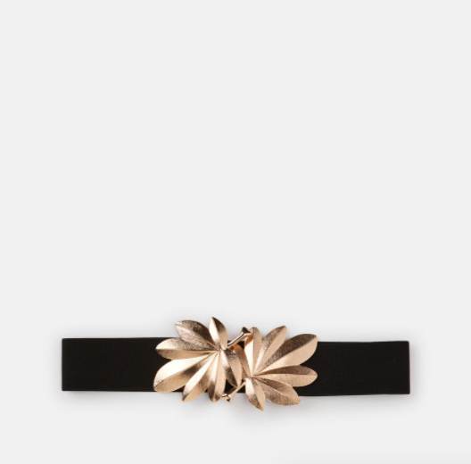 Cinturón en color negro, confeccionado en tejido elástico, rematado con dos originales adornos en forma de hoja en la parte delantera. Seguro que se te ocurren muchos estilismos a los que podrías incorporarlo.