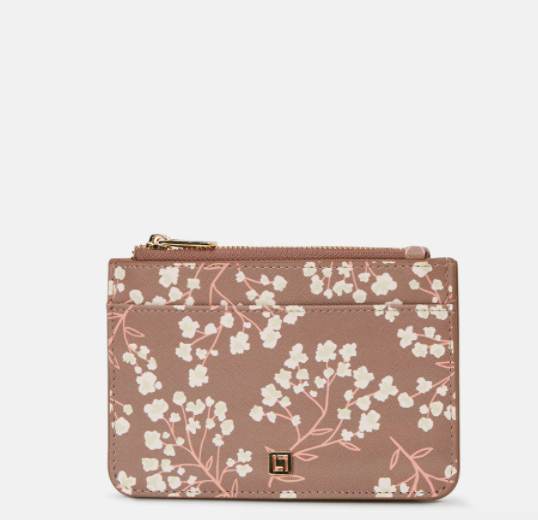 Mide 2 cm de ancho por 15 cm de fondo y 10 cm de alto. Incluye un bolsillo con cremallera para guardar el dinero y hueco para tarjetas. Con un bonito color marrón con estampado floral a contraste.