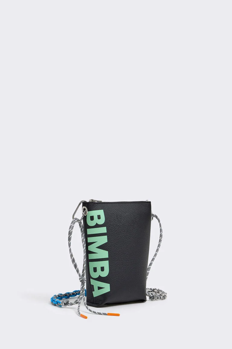 El primer producto de la lista es este minibolso bandolera de piel de color negro. Es un bolso pequeño con medidas 15,3 x 19 x 3,8 cm, asa de cadena regulada y un exterior personalizado con el logo estampado en grande en color azul. Por otro lado, tiene el cierre exterior con cremallera.