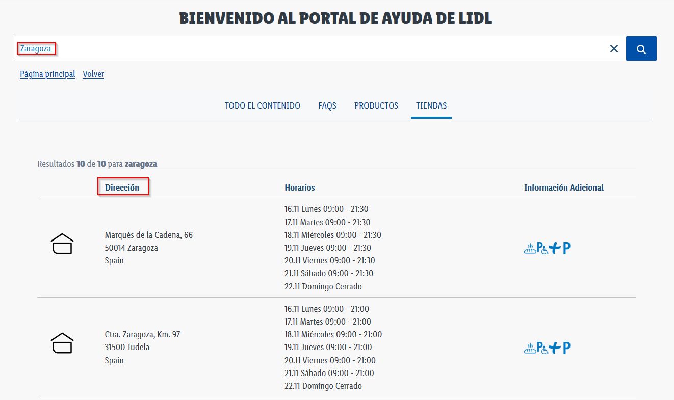 Esta sección tiene dos utilidades. Por un lado, te permite saber cuál es el más cercano a tu zona, mostrándote los supermercados cercanos a la localidad elegida. Por otro lado, te permitirá saber cuáles son los horarios de apertura, incluyendo así la apertura del domingo. Asimismo, podrás descargar el folleto de ese lugar para ver las ofertas, un mapa sobre cómo llegar y otros servicios, como aparcamiento, aparcamiento para discapacitados, panadería, recarga de coche eléctrico o si tiene o no surtido completo.