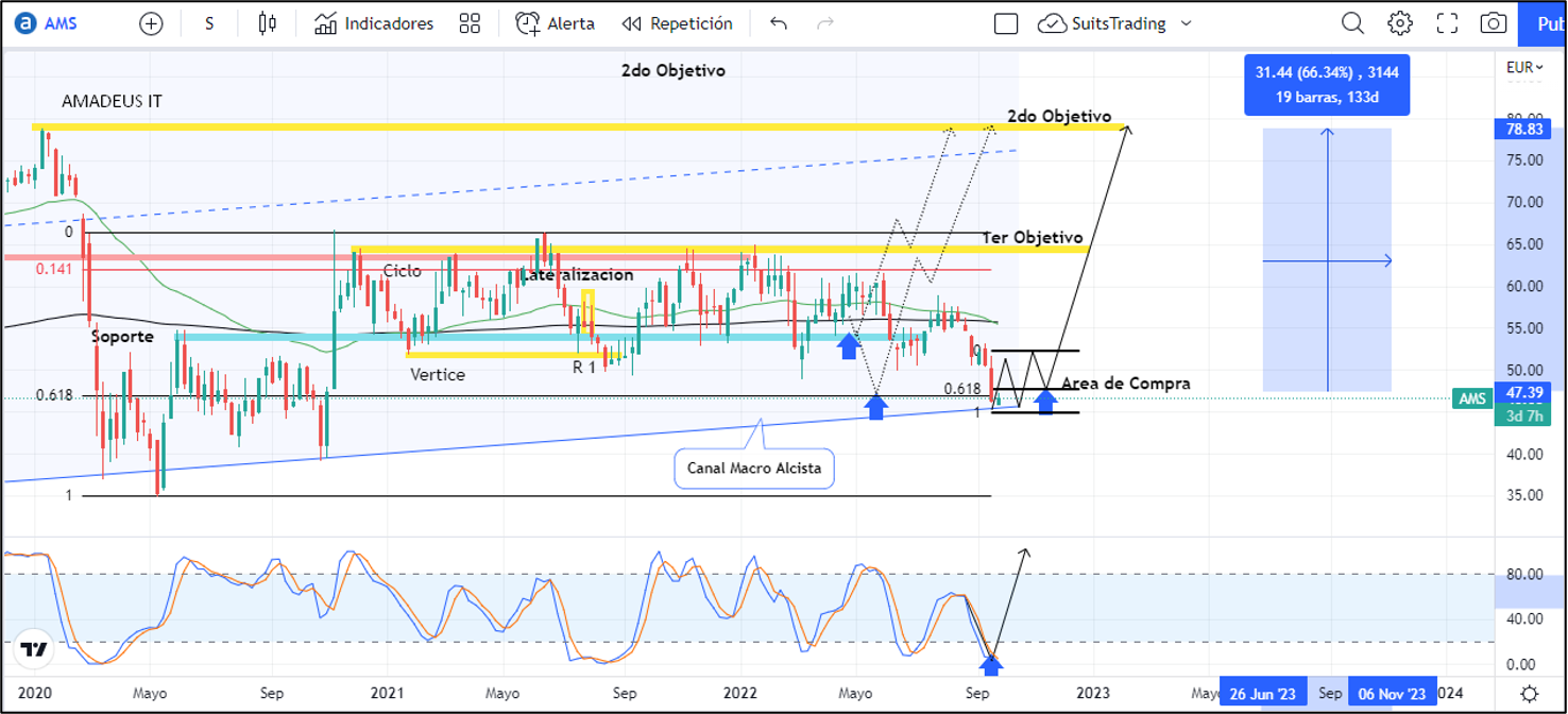 Desde allí buscaríamos las confirmaciones pertinentes para ejecutar compras en busca de los mismos objetivos planteados. El primero de ellos en inmediaciones de la resistencia en niveles de 64,8 euros. El segundo objetivo arriba de 78 euros que corresponden a los niveles previos a la pandemia. Operación que representa más de un 65% de revalorización para las acciones de Amadeus.