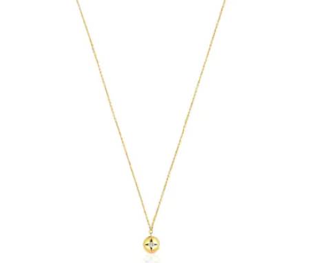 En este caso te destacamos un collar de 45 cm de longitud, elaborado a base de oro amarillo de 18 kilates. Con un pequeño colgante en forma de medalla con una estrella de diamantes de talla brillante.