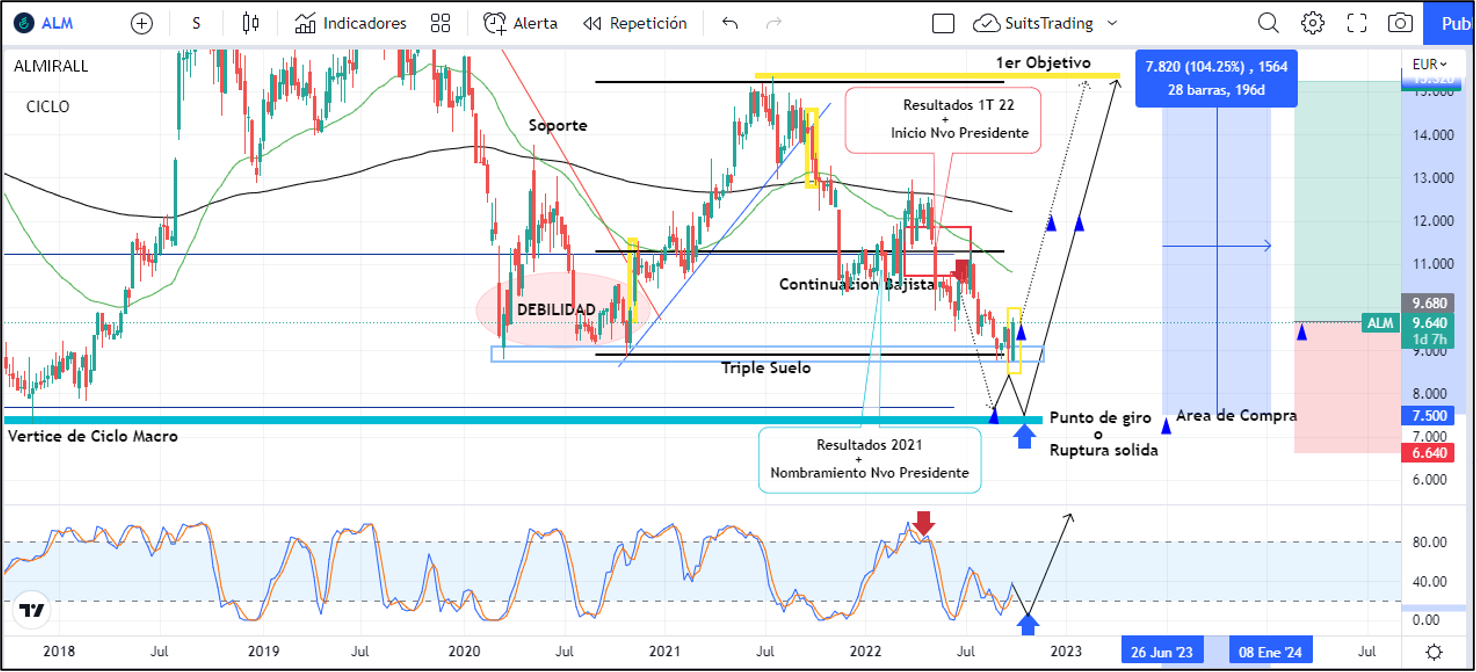 Sin embargo, el gráfico de marco mensual aún mantiene un patrón bajista que podría llevar el precio inicialmente por debajo de 7,5 euros que corresponden a los mínimos de 2017 y al vértice del cierre de ciclo macro mensual. Área que tenemos delimitada y que compartimos con nuestros lectores el pasado 8 de junio. En esa ocasión, informábamos de la ubicación del precio por debajo de 10,4 euros la cual generaría mayor continuación bajista dado el patrón que incorpora una debilidad registrada efectivamente con la llegada de la pandemia. De momento, y claramente dado el espectro económico mundial, la euforia por las acciones de Almirall la valoramos alcista solo si cierra con vela semanal a modo de envolvente alcista mas una vela de confirmación, o si el precio visita el mínimo en 7,5 euros y realiza formación de truco (V invertida) para confirmar el fin de las caídas.