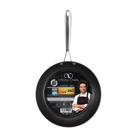 La base cuenta con un sistema de turbo inducción con calentamiento rápido que permite ahorrar tiempo y energía. El mango es ergonómico de acero inolvidable y se puede usar en todo tipo de fuentes de calor. Está libre de PFOA y cuesta 17,99€.