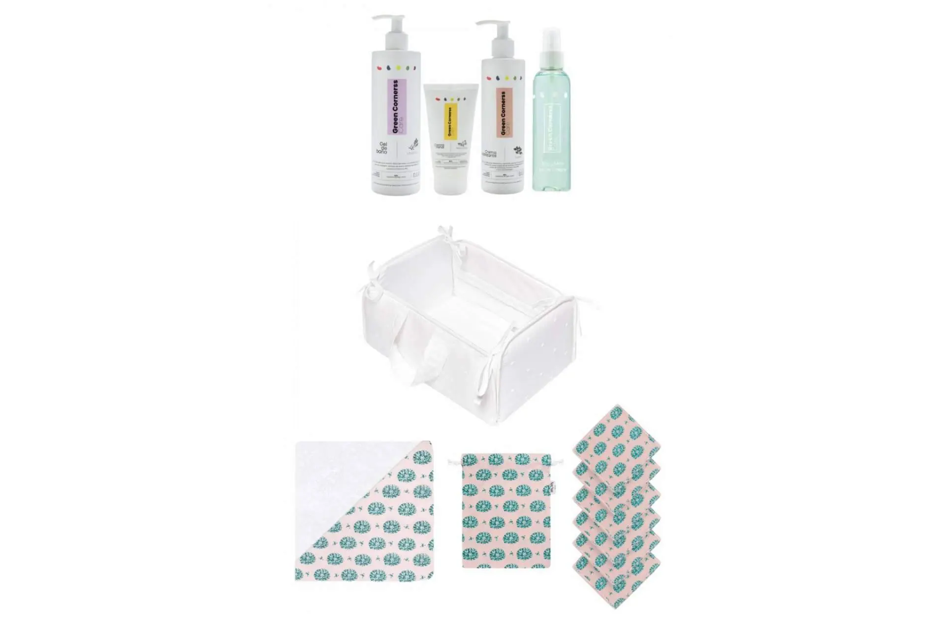 El pack está compuesto por 7 productos: 4 productos de Green Cornerss y 3 productos de Nait Nait disponibles en 5 estampados diferentes. Los productos que incluye Green Cornerss en la cesta son su Crema Hidratante de Avena, el Gel de Baño de Lavanda, la Crema de Pañal de Manzanilla y la Colonia Baby & Me. Junto a estos 4 productos, también se encuentran los cestos de pañales, las toallas de baño y las toallitas higiénicas para limpieza de Nait Nait.