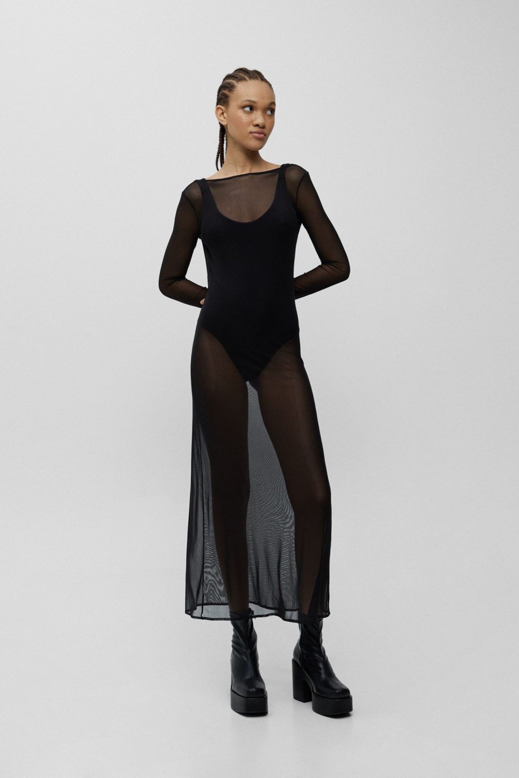 El siguiente vestido que te vamos a mostrar no es apto para todo el mundo. Solo las más atrevidas se atreverán a llevar esta espectacular pieza cuyo diseño está a la altura de las grandes firmas. Este vestido largo de tul con escote recto, manga larga y silueta fluida de Pull&Bear no tendría nada especial si no fuera por su tejido transparente. Sin duda, si te atreves a llevarlo no vas a pasar desapercibida en ningún sitio. Lo mejor es su precio, ya que puedes encontrarlo por tan solo 19,99 euros.