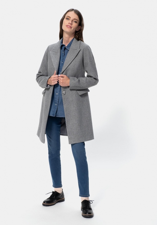 Su color gris nunca pasa de moda y pega con todo. Un abrigo de largura intermedia, con cuello solapa y cierre mediante botones, y al que no le faltan los bolsillos con solapa.
