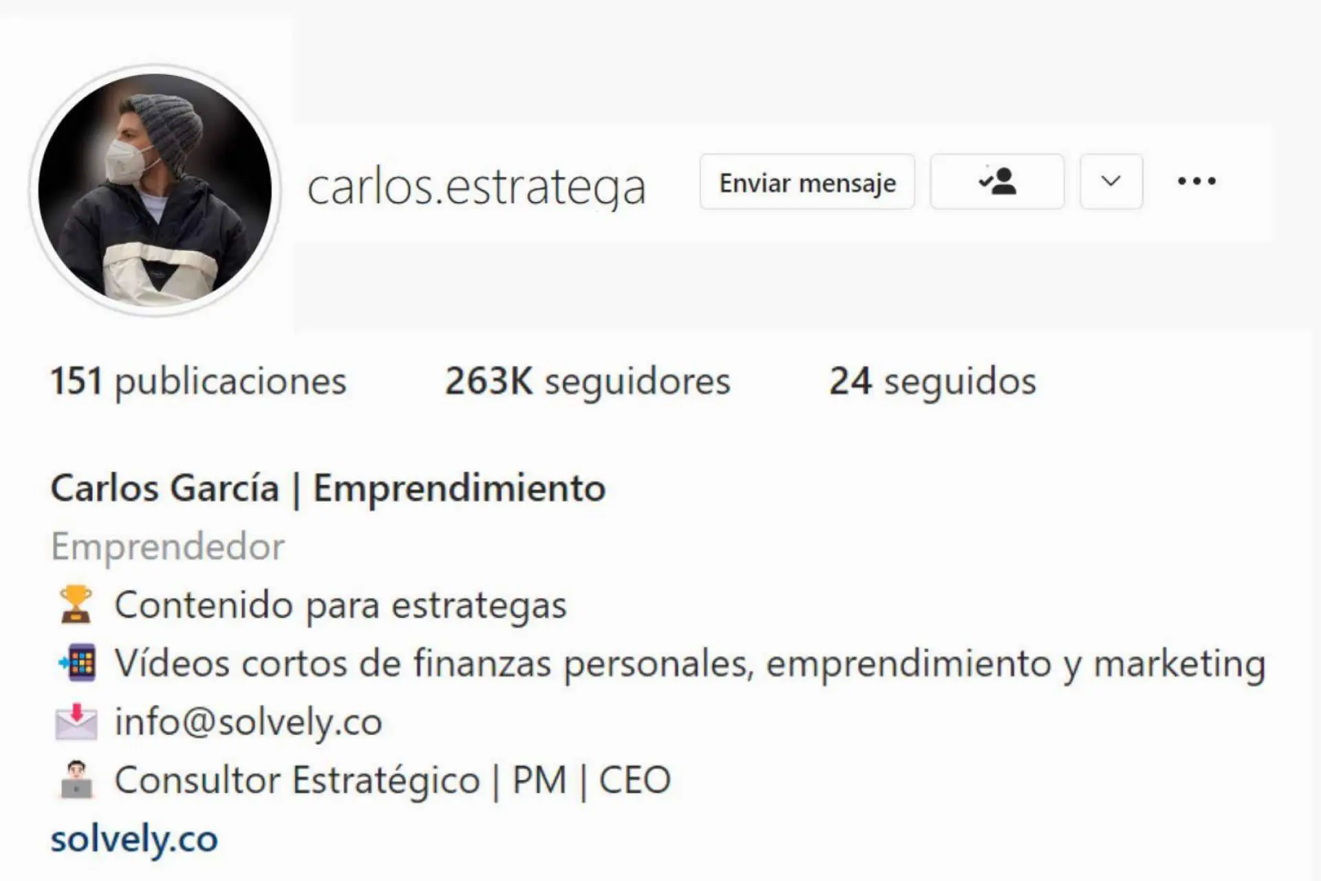 Además de ser un creador de contenido, con vídeos cortos sobre finanzas personales, emprendimiento y marketing, Carlos García proporciona un servicio de consultoría estratégica para autónomos, pymes y grandes empresas, a través de su empresa Solvely. En ella, responde a las necesidades de sus clientes, a quiénes les ofrece un acompañamiento en el desarrollo de estrategias de marketing y en la optimización de los procesos operativos. Consiguiendo así, maximizar las ventas y reducir los costes.