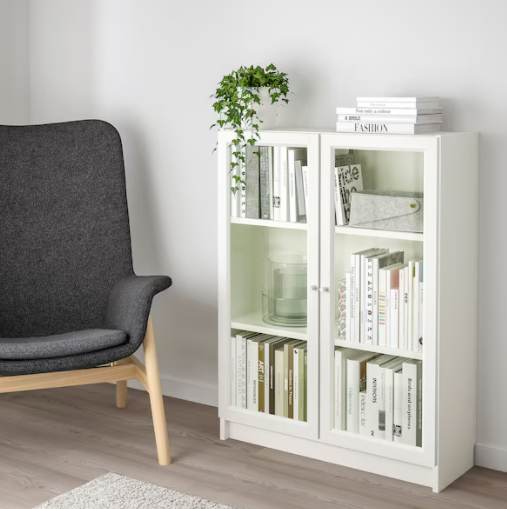 La vitrina Billy Oxberg combina estructura en blanco con puertas de cristal, y solo mide 80 x 30 x 106 cm. Queda perfecta en el salón, en la cocina, y en los dormitorios. Incluso podría funcionar como armario auxiliar en el cuarto de baño.