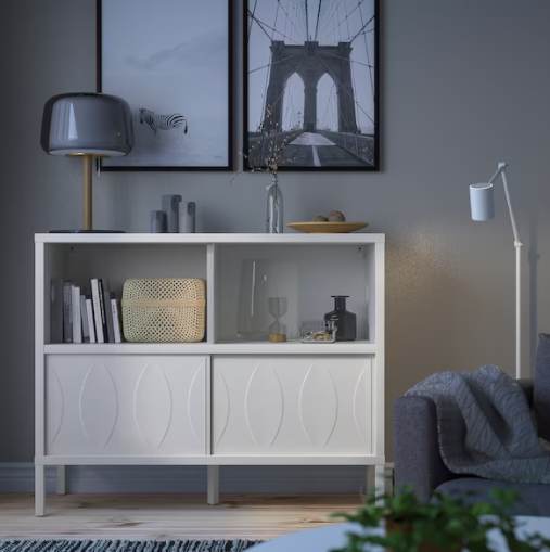 Este práctico mueble te permite guardar tus cosas de dos formas. Las que quieras mostrar pueden estar en las estanterías superiores o en la parte de arriba del mueble, y las que desees ocultar pueden permanecer tras las puertas con relieves.