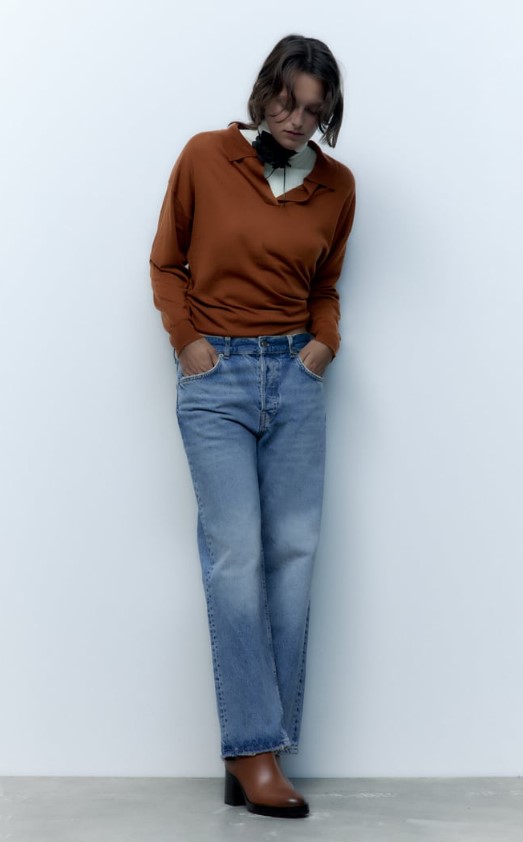 Seguimos mostrándote prendas que hemos encontrado en la nueva colección de Zara que son un acierto para el entretiempo. Vimos este polo de punto con cuello solapa y manga larga. El color es un marrón muy otoñal, pero también está en negro. El material con que está confeccionada es 38% acrílico, 37% poliéster, 20% nailon y 5% lana. Disponible en los talles del S al L. El precio de venta es de 27,95 euros.