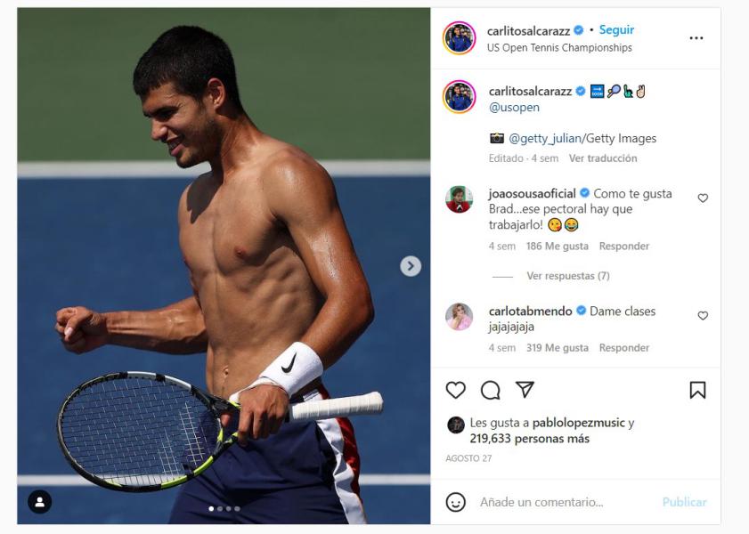 Un comentario que escribió la intérprete e influencer en un post de Instagram de Carlos Alcarzaz dio mucho que hablar. En la foto el tenista aparecía entrenando sin camiseta y luciendo su más que comentada musculatura. Todo un portento físico que la joven actriz no dudó aplaudir a su manera, proponiéndole ser su profesor de tenis. Eso sí, esas risas en su comentario podrían esconder el propósito de querer hacer horas extra con el vigente campeón del Mutua Madrid Open. «Dame clases jajajajaja», le escribió Carlota Boza.