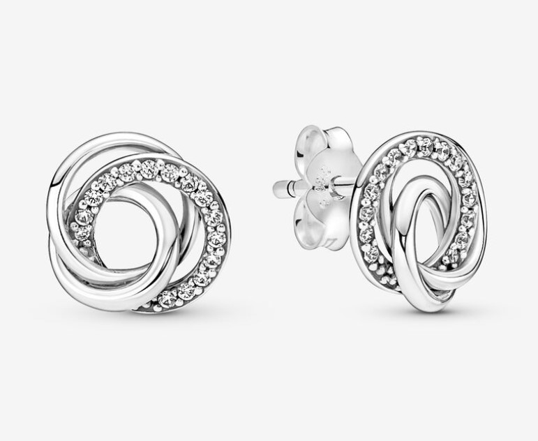 Para estos aros, Pandora se inspiró en el amor imperecedero. Los Pendientes de botón Círculo Familiar Siempre se presentan con tres aros que se entrelazan, dos de ellos en plata de primera ley y un tercero embellecido con una fila de circonitas cúbicas transparentes engastadas en pavé. La armonía de los distintos tamaños simboliza vuestra unión familiar a pesar de sus diferencias. El precio de venta es de 49 euros.