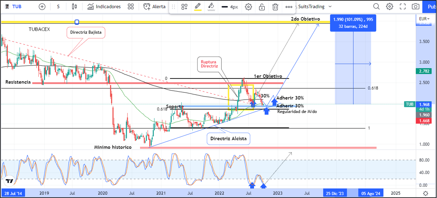 El presente artículo es una actualización inminente del artículo publicado el 23 de agosto denominado “Tubacex: No solo con criptos se puede ganar un 100% de beneficio”. Allí expusimos los movimientos que el precio podría desarrollar, remarcando que, “técnicamente el precio podría desarrollar previamente, un retroceso en modo de truco, es decir, V invertida que visite y respete nuevamente el soporte semanal sobre 1,95 euros en confluencia con el área de regularidad y la directriz alcista macro ubicándose nuevamente sobre las medias móviles exponenciales de 50 y 250 periodos”.