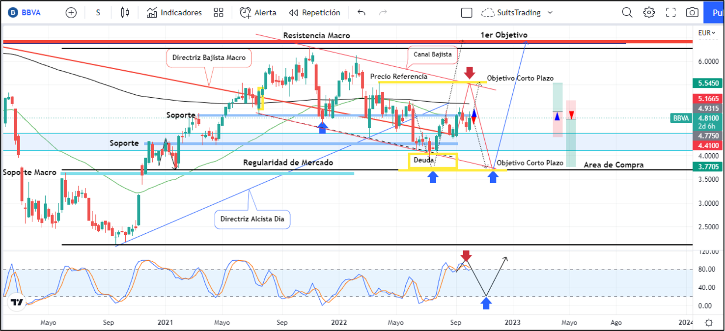 Con el anuncio del pago del dividendo, las acciones de BBVA comenzaron a desarrollar un movimiento alcista que en la semana recorre más del +5,1%; sin embargo, tiene de frente la media móvil exponencial de 50 periodos de corto plazo y un precio de referencia correspondiente a un soporte macro registrado en marzo de 2021 que, para este caso, funciona como resistencia. Por esta razón, es muy probable que, si el precio desarrolla una ruptura sólida en la media móvil, tendrá la fuerza suficiente para buscar el nivel superior del canal bajista que venimos trabajando desde julio del año pasado con el que podrá visitar niveles de 5,5 euros por acción, lo que corresponde a una revalorización de más del 12% estimada al corto plazo.