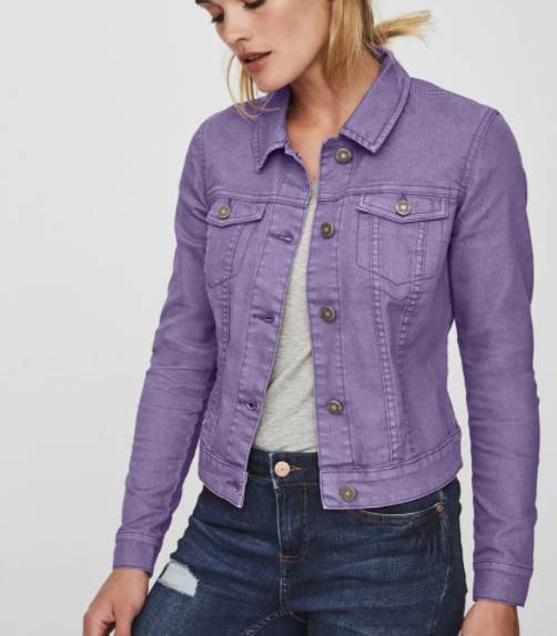 Como decíamos antes, la cazadora vaquera no pasa de moda, pero quizá sea el momento de salirse de los colores habituales. Con este diseño en morado, ten por seguro que vas a llamar la atención.