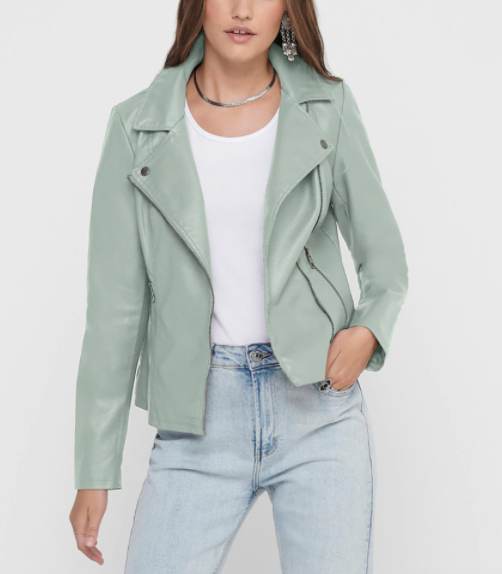 Diseño biker corto y entallado, con cierre mediante cremallera y cuello de solapa. Destaca especialmente por su impresionante color verde agua, que queda perfecto en combinación con tonos claros y oscuros.
